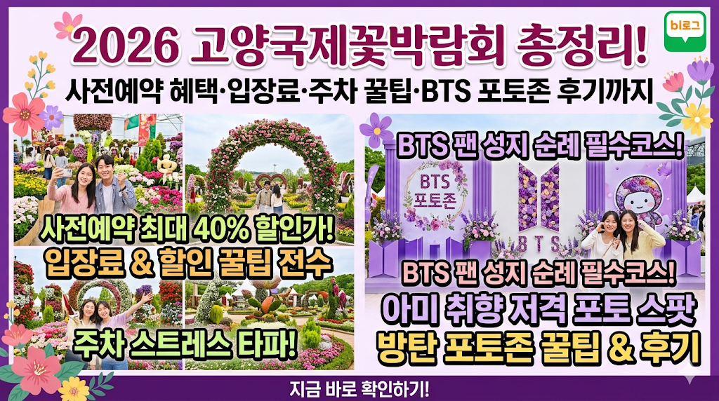 2026 고양국제꽃박람회는 그 어느 해보다 볼거리와 즐길 거리가 풍성하게 준비되어 있습니다. **"결론은 차를 두고 지하철을 타고 오셔서 3,000원 할인도 받고, 보라빛 꽃길에서 인생샷을 건지는 것"**이 진정한 승리자라는 사실! 사랑하는 가족, 연인, 친구와 함께 일산호수공원에서 향기로운 봄날의 추억을 만들어보세요.
